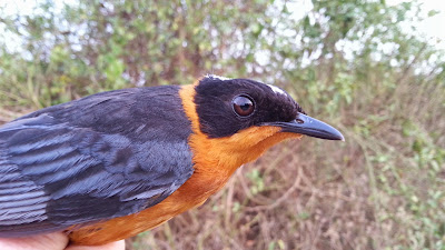 The first site was called Mpanga Forest. As the name suggests, it was a forest site and we were ringing along the edge of the woodland. It was relatively quiet for ringing, with a small number of lovely birds, but it was a welcome change of pace and eased us into the ringing gently as the initial 10 days of our tour had been very intense. The habitat at Mpanga where we chose to site the nets was forest edge and nets were erected the night before and were safe in-situ until we left. We only ringed a small number of birds but it did give us the opportunity to look at the different feather wear and moult strategy of different species. Although we didn't get to catch many birds, the ones we did were smart. White throated greenbul, red crowned robin chat, olive sunbird, green twinspot, green hylia and yellow throated tinkerbirds were all ringed during the two days.